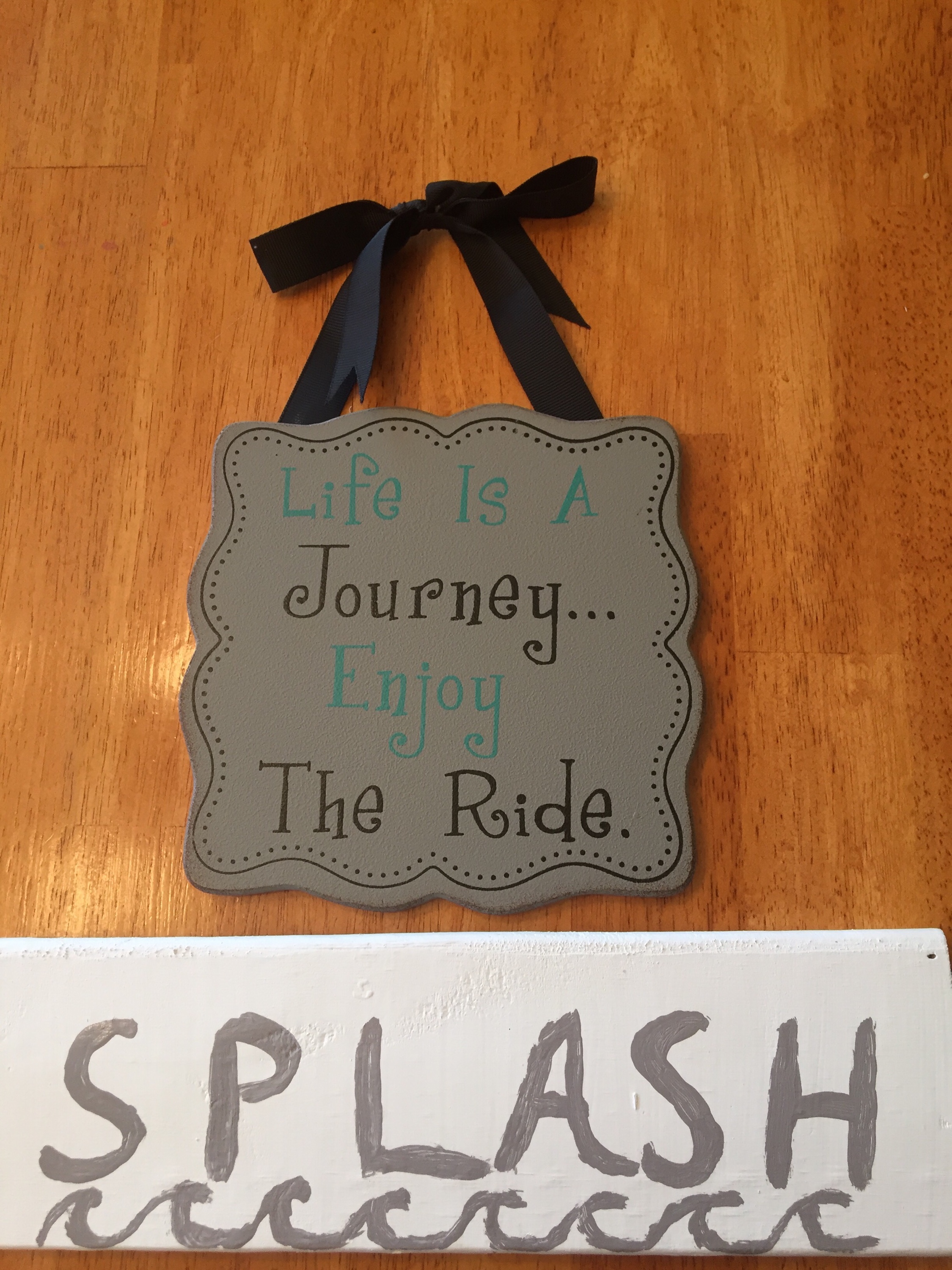 These two signs hang in my cellar way and bathroom. I decided I wanted more words around instead of objects so both directly involved re painting and decorating. Loved the journey one when I saw it and only later did it resonate with me how Warrior always said: “it’s the journey, not the destination.” The Splash sign came about when I wanted a word on my corner shelf in the bathroom . Only later after admiring it did I remember that was his finishing move! How could that slip my mind?? I swear neither sign was placed on purpose but timing is everything and I have come to believe this.