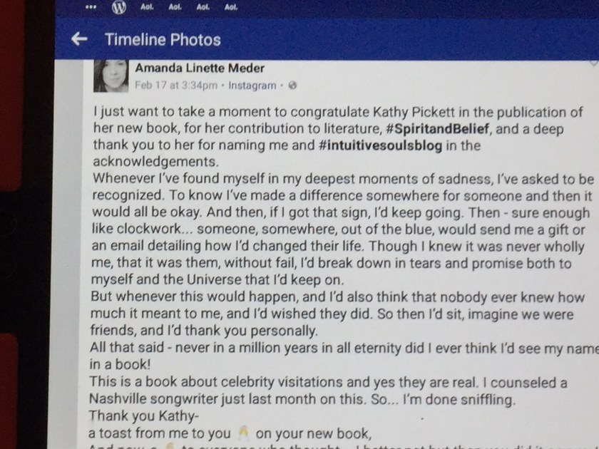 I finally decided to send my book to one of my influential medium mentors and here is her response on my Facebook page: Kathy Pickett. You can find the whole post there. You can also find her at: