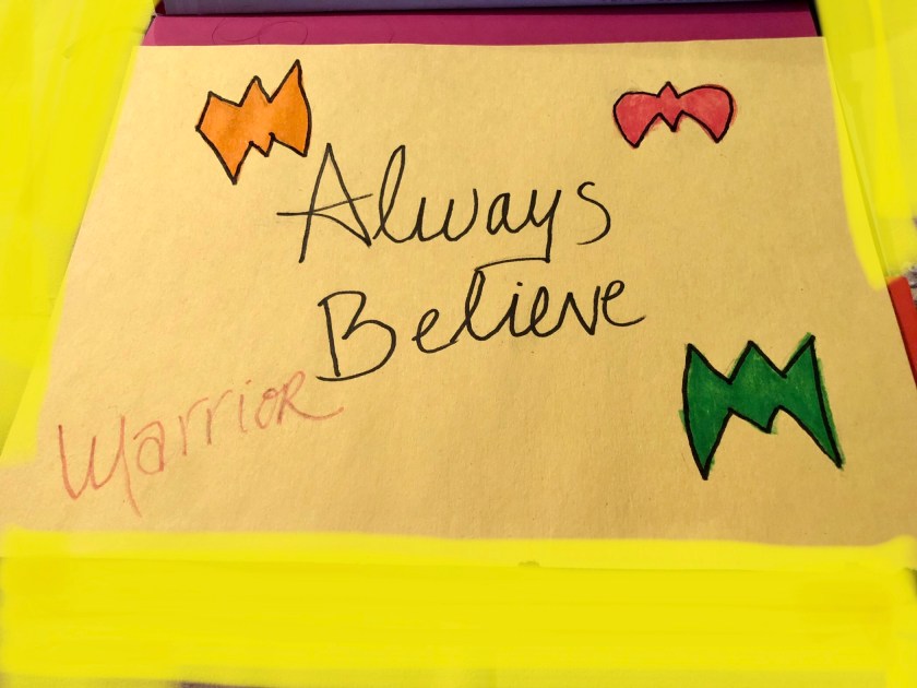 My Dad’s big 70th birthday party was the next night and with sleep, her butterflies faded a little. She asked me to paint them back on so she could show off her face to everyone. I obliged but told her Mama would do the best I could and to not get mad. My hands were shaking as I picked up that first brush and chose her color. Why? Come on Kathy– this isn’t his mask, what’s wrong with you? Well, that was how much of my grief got displayed. I just told her I was nervous since that wasn’t something she rarely asked of me. Warrior’s mask- No. Face paint-yes. It still mattered a lot. Never could I even put on the mask from the book “A Life Lived Forever.” I had held it up to my face but the strap broke. I wasn’t meant to wear it…