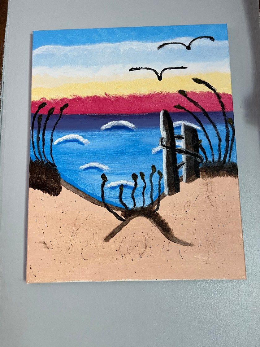 I actually struggled getting the skyline just right. Not perfection as this class might’ve frustrated my daughter, but just the colors. Where you see that hot pink~ should be orange! I tried but couldn’t keep over-correcting so pink it remained (: I love both colors but guess mine needed to stay pink. My favorite part is the fence posts. They just pop out from a distance but with water pictures, I usually get lost in the perspective. I never went there again and that place is now a relocated popcorn shop. The pandemic am sure factored in but grateful to have had that opportunity while proving my painting ability, albeit a guided one.οΏΌ